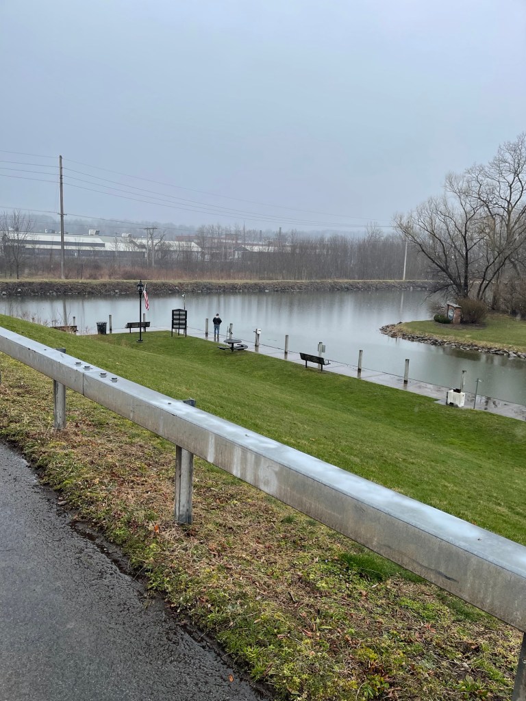 We usually go for a walk on Sundays and so, we togged up in rain gear and headed out for a stroll. Erik lead us along the canal path. It’s a path that the mules walked as they pulled the barges up and down the canal. There was a bridge that was closed to vehicle traffic. I’m not a fan of heights and I chose the paved sidewalk over the mesh bridge. I kept telling myself, “You’re going to be okay, you’re going to be okay. You can do this! You’re almost over the bridge!” We met a couple walking their Bernese Mountain dog. They also filled us in on information about the town and area. I asked what industry feeds the tax base and they responded with, “Well, the Mormons come here in the summer!” Hahaha…well, here we are!