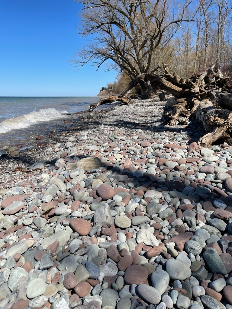 We saw families that gathered for Easter dinner. The cars pulling out of driveways, hugs and kisses blown as they went their separate ways. It was windy and cold at first, thus, we bundled up. I usually take 45 minutes to walk 3 kilometers but these walks take me an hour because I need to stop and look at the flora and birds. Erik thankfully walks to my pace. There is a delightful creek running through Palmyra and I love to stop and watch it.