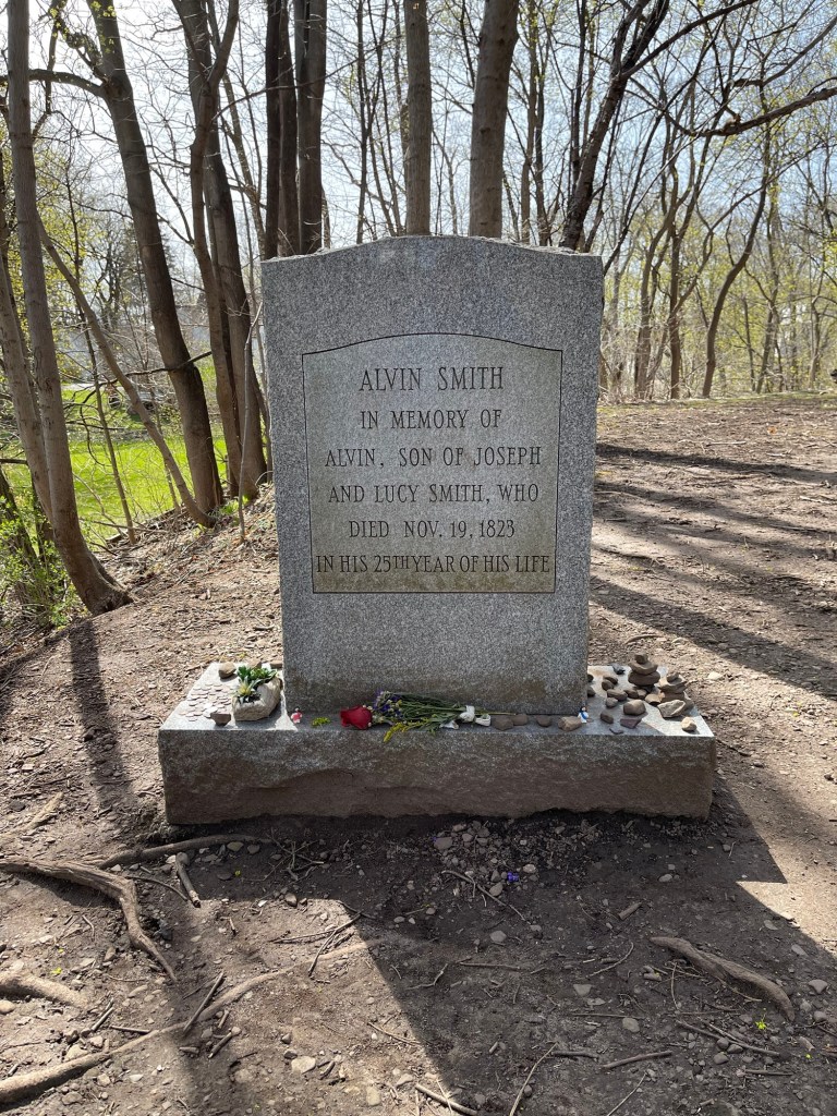 Our walk took us to the old cemetary of Palmyra. It is on the same block where we live. There is a set of concrete stairs going up the hill. We were looking for Alvin Smith’s grave site. There were other gravestones scattered throughout the hilltop. Alvins’ is well cared for as is Jonathan Swift, the founder of Palmyra in 1790. It was orginally known as Swift’s Landing and changed to Palmyra in 1796.