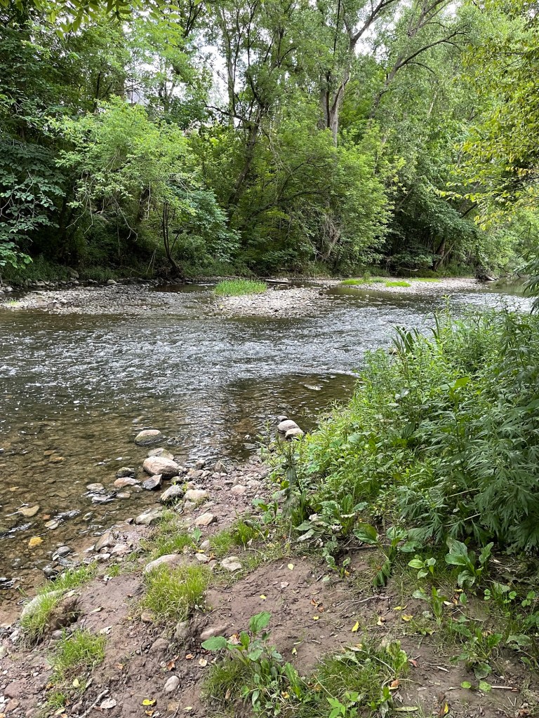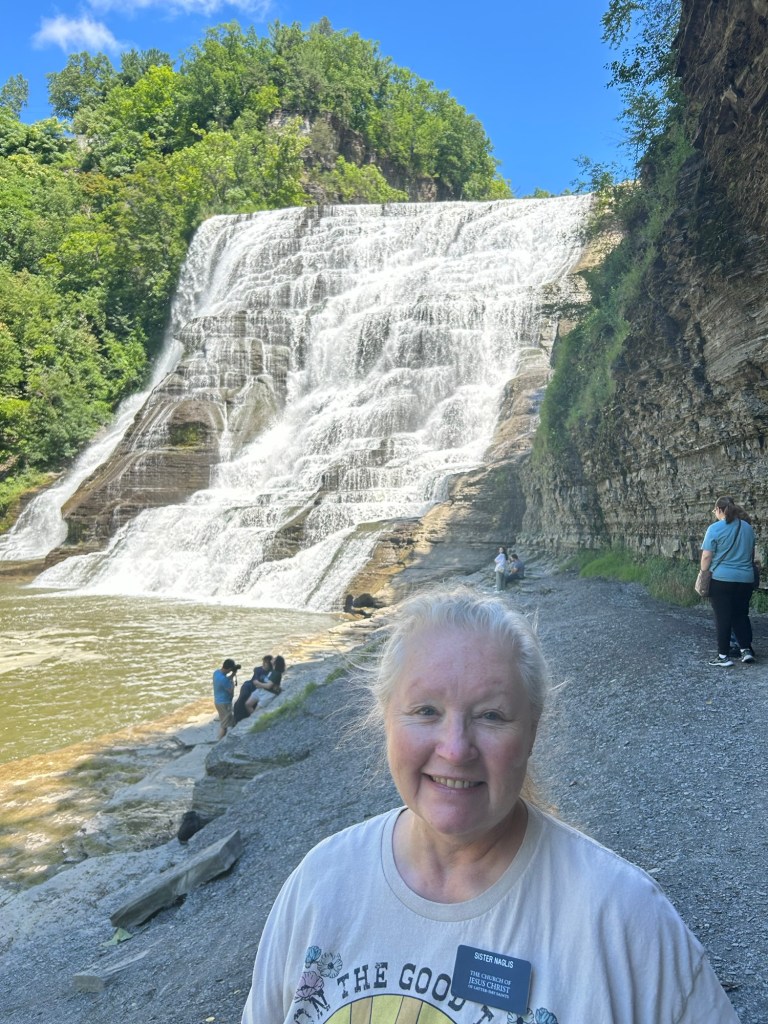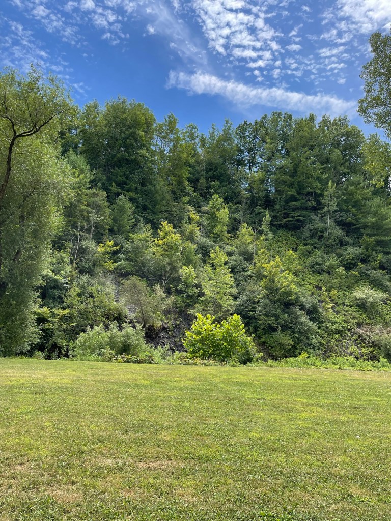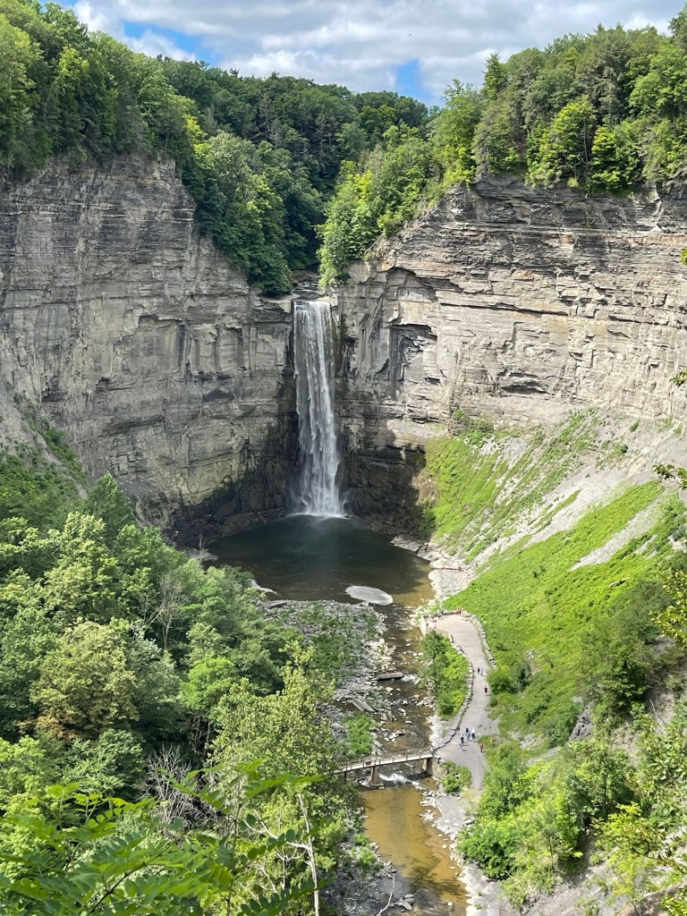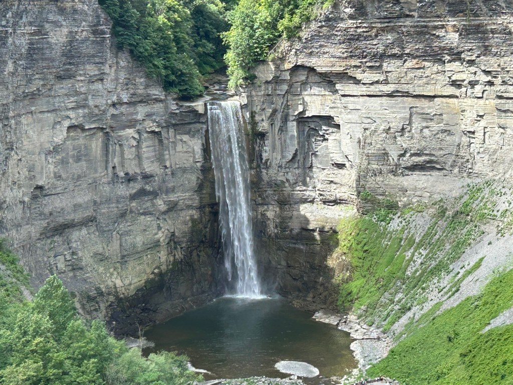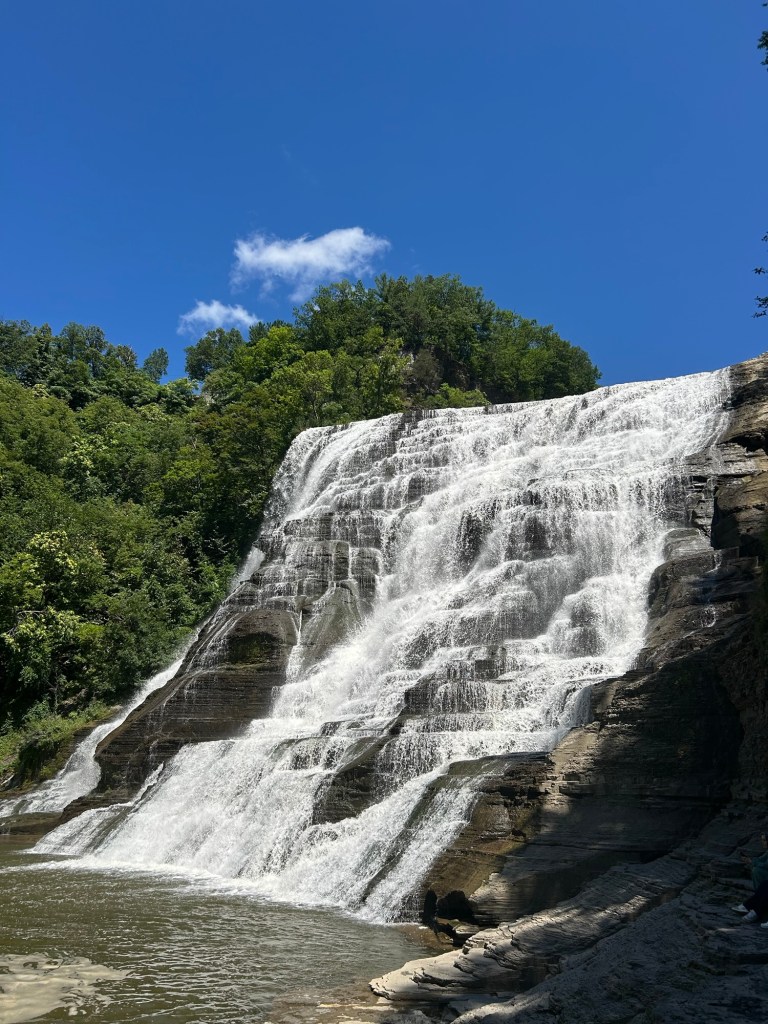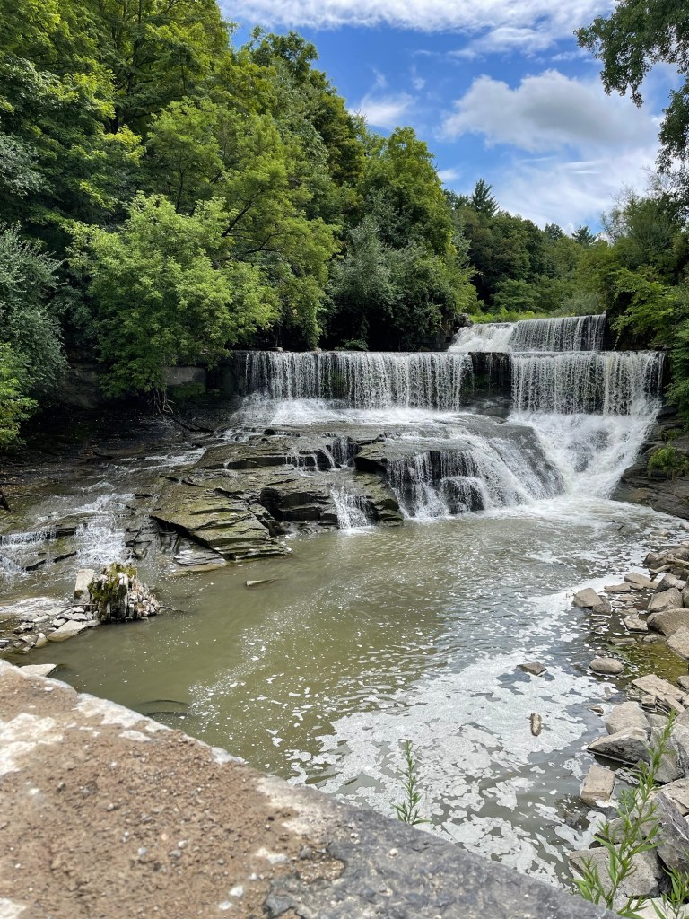 Then it was time to go waterfall hunting. Erik had Google Maps take us to Cascade Falls, but Google wanted to take us through a farm that led to a cliff with a two-hundred-foot drop to the falls. The farmer gave us correct directions, and off we went. We parked and walked to the falls. It was an easy walk, but it was quite humid because of the intermittent rain showers. There was a nice little pavilion that is at the bottom of Cascade Falls.