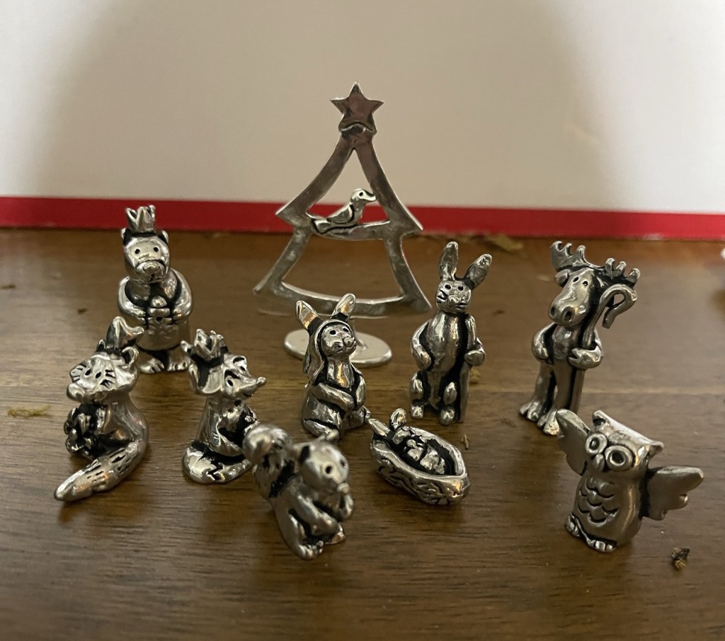 In my misery, I told myself that Christmas is just one day. Instead focus on the Savior and his life and that brought me comfort and happiness. Earlier this year, I purchased a tiny pewter Nativity set comprised of woodland animals. The moose (shepherd) was what sold me on it.