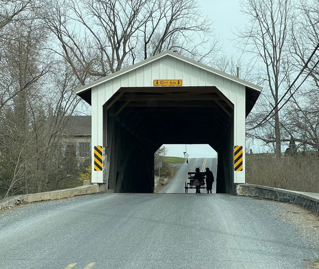 The Amish lady had to get off her cart because her pony balked at crossing the bridge. She lead the pony across and then got back on her cart.