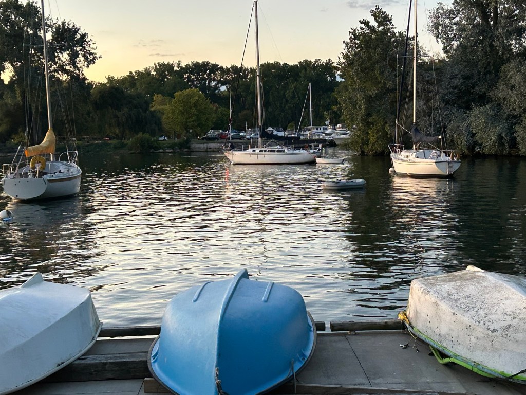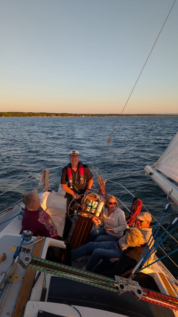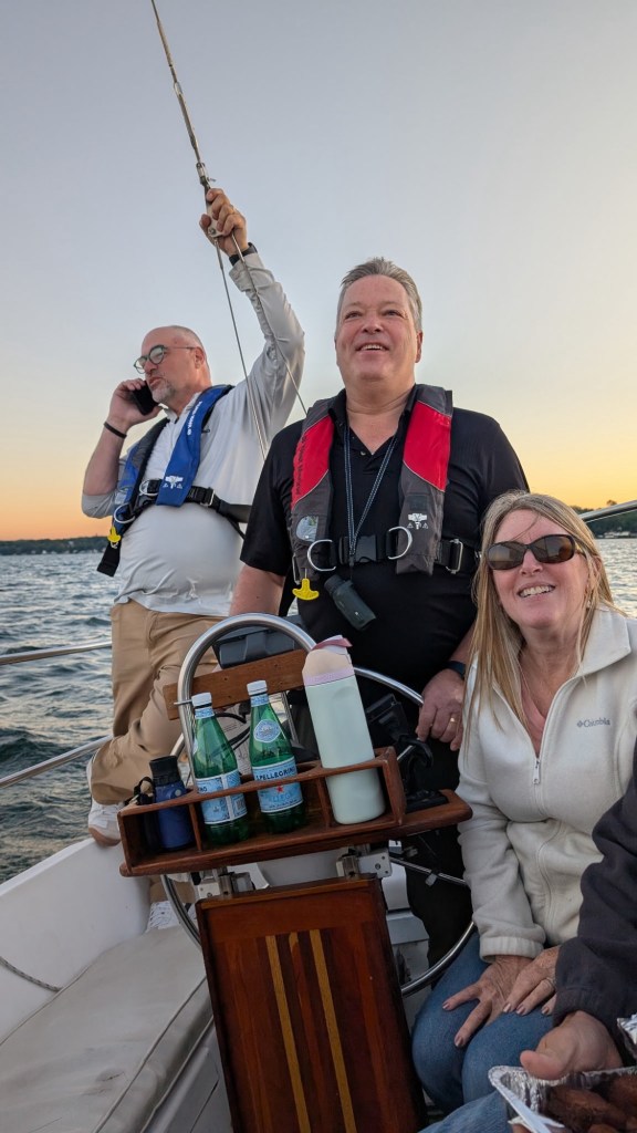 Moon over the lake Having snacks Erik on deckErik takes the helm and Gennaro gets the captain’s hat for him to wear.Needing to tack (hilarity ensues)Captain Erik Captain Gennaro