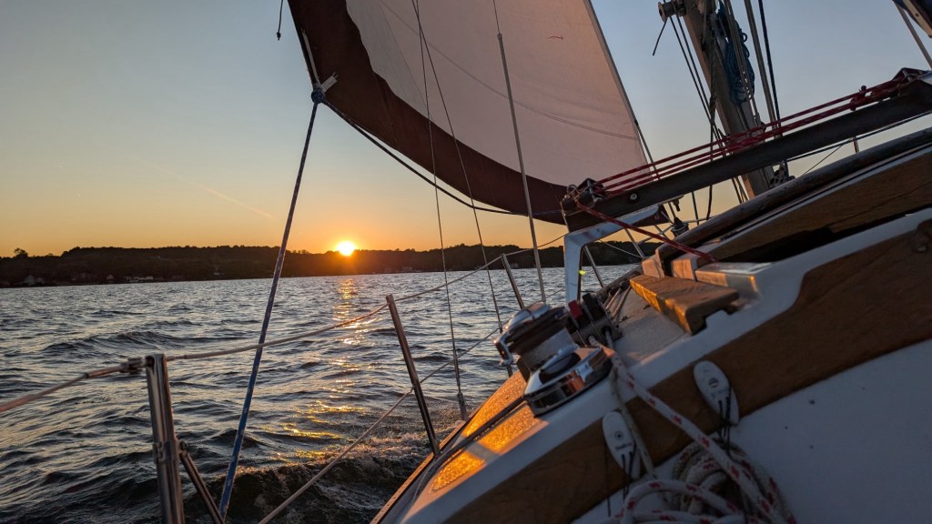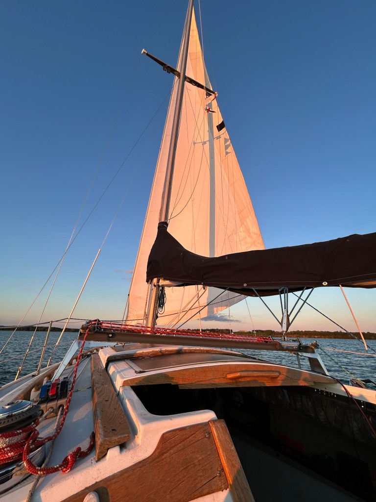 I even wore a jacket The sun setting for another day.Boats moored & dinghies on the dock.Sailing with the jib.