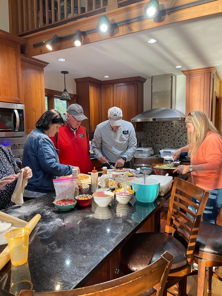 After our cruise around the lake, we headed to the kitchen to make pizza. The Clay’s have a pizza oven that cooks a pizza in 90 seconds. I stayed in the sunroom to avoid getting “glutenized” and watched as everyone created their pizzas. We contributed by bringing salads. Kathy had something special for dessert for everyone. Great conversation flowed and plenty of pizza was had. For dessert, Kathy made her famous cream puffs. It was so cute, because she was telling us how she makes them and Marc didn’t want her to share her recipe and techniques. She covered the tops of the cream puffs with ganache and they looked beautiful. Erik was able to bring an extra one home because I couldn’t eat them.