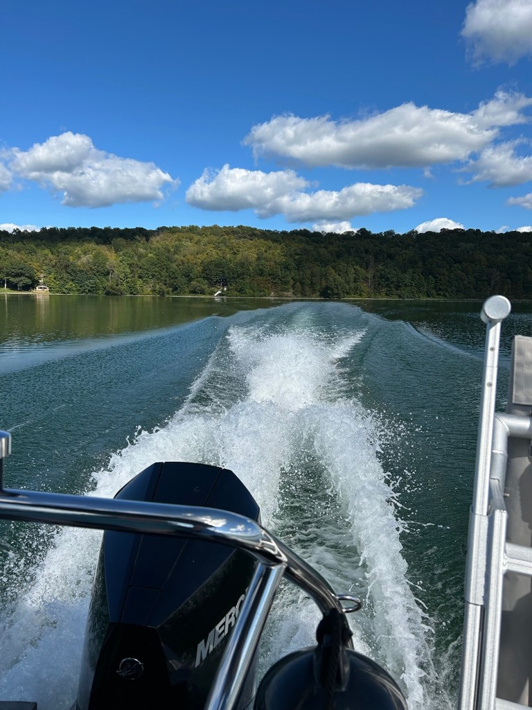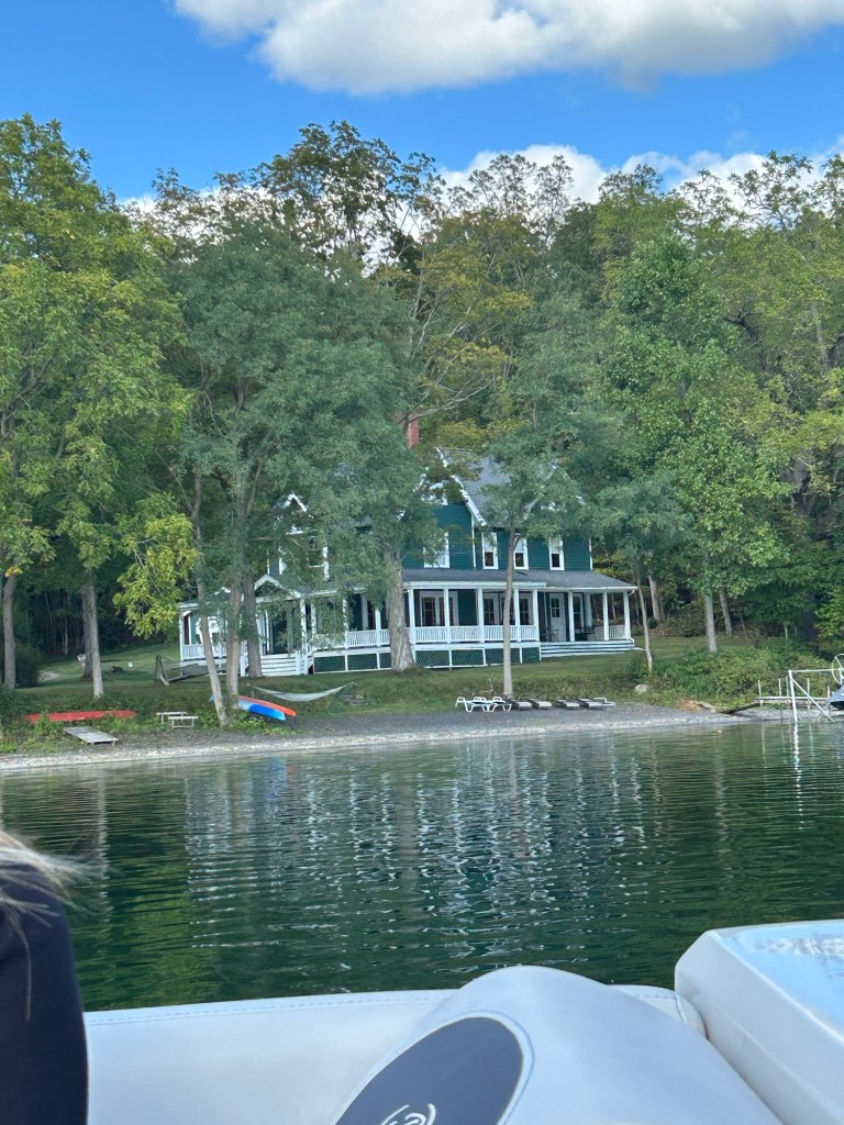 On Monday, the Clay’s invited the temple missionaries to come to their home for a pizza party and a boat ride around their lake, Owasco Lake. Owasco is the third eastern most lake in the Finger Lakes and the sixth largest. The name is derived from the Iroquois word dwas-co, meaning bridge on the water. It was a beautiful day and we drove out with the Gurr’s. Marc Clay is a sealer at the Palymra temple, so we’ve gotten to know them by working with them. The Clay’s home sits lakeside and has incredible views. Eight of the temple missionaries made it to the party and were in for a wonderful evening. Marc loaded us on their pontoon boat and gave us a tour of the lake and where certain family members resided. We loved the viewing of the homes and some of us picked out homes that we would dream of living in.