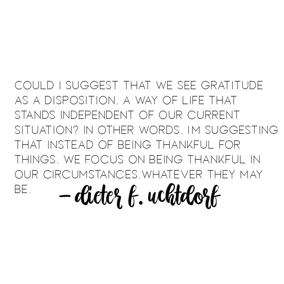 My prayers are always full of gratitude. I truly am grateful for all things, come what may. Life doesn’t always turn out the way you thought. I’ll bet if you look back at the past fifteen years of your life, you probably couldn’t have guessed at how it was going to go. Despite all the hardships and trials that we endure, it is important to have gratitide. President Nelson expressed this very well.