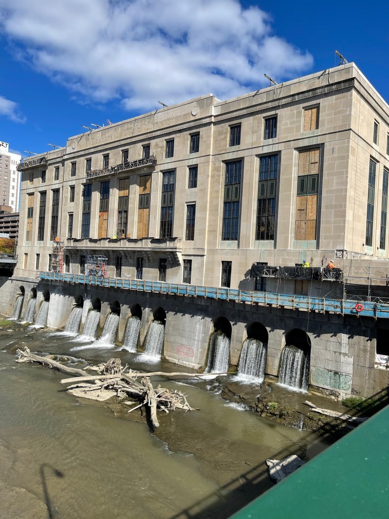 The Stevens told us about Dinosaur Barbeque in Rochester and said it was a really interesting restaurant because it is in the old train station building overlooking the Genesee River. It took me a bit to get excited about going out on our anniversary, but once we were there, I was glad that we came. We parked on the bridge that crosses the river and saw the Central Rochester Public Library across the road from the restaurant. It is impressive! Built in 1936, it is known as the Rundel Memorial Library building. We found the meal delicious and I had leftovers for later.